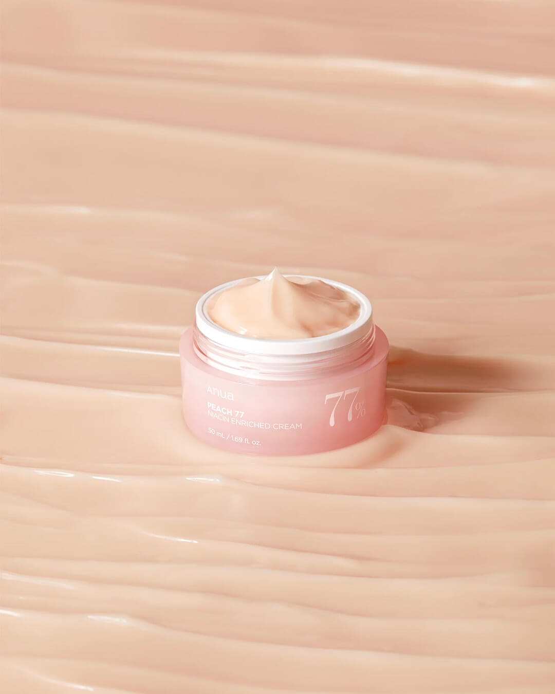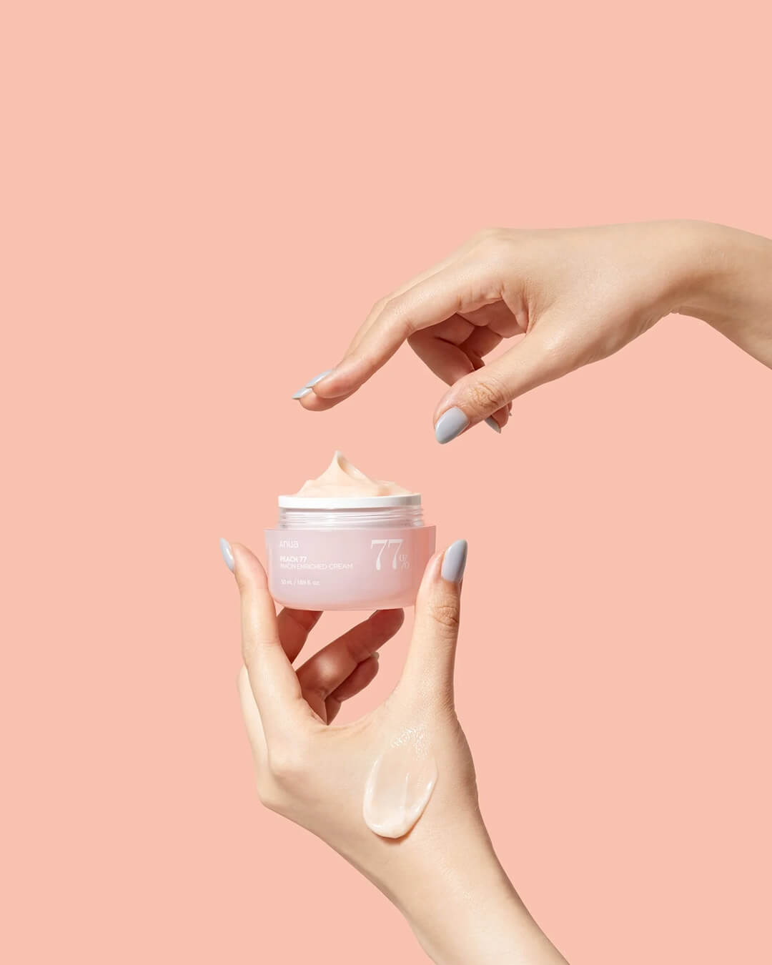 Anua’s Peach 77 Niacin Enriched Cream used 77% Prunus Persica (Peach) Fruit Extract to hydrate & renew the skin’s barrier. Its pudding-like, gel-like texture absorbs easily with no stickiness, leaving the skin more plump and dewy.