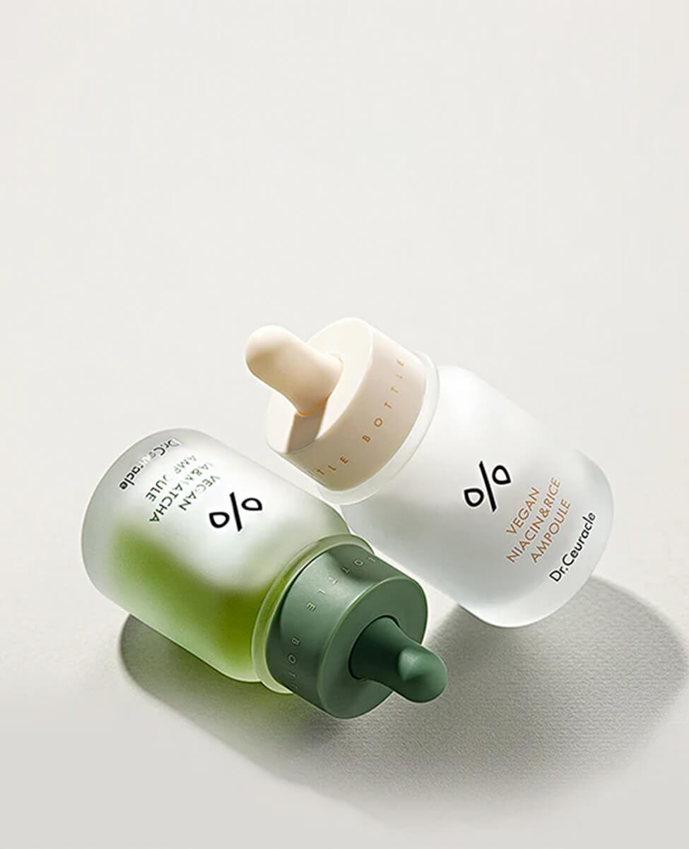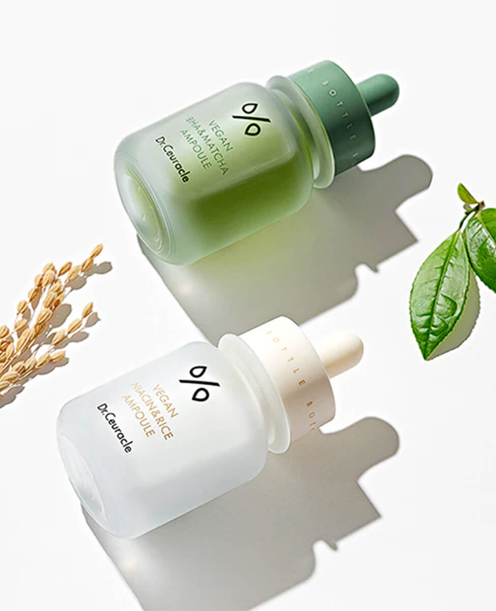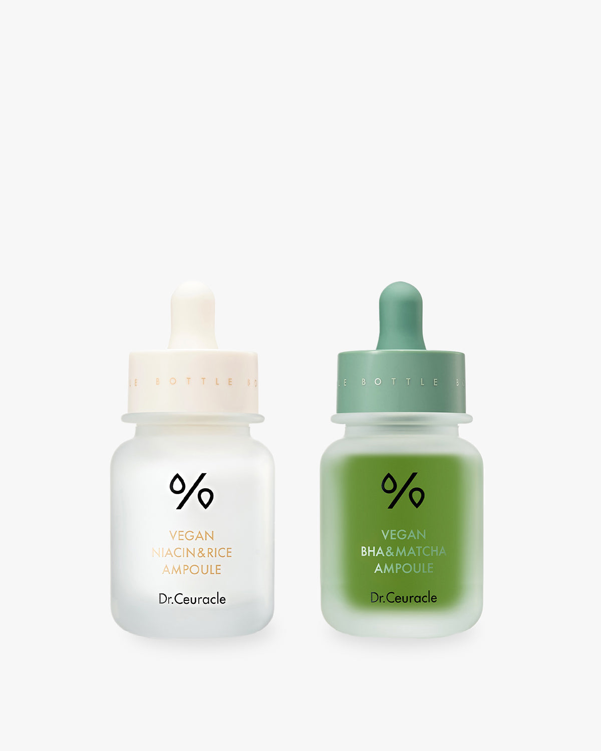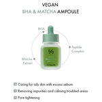 Dr. Ceuracle Vegan BHA & Matcha Ampoule includes BHA (0.5%) to balance excess sebum, while a peptide complex reduces inflammation and strengthens elasticity and skin regeneration. Matcha extract, from Jeju Island, provides antioxidant-rich calming properties. Its lightweight, non-sticky texture absorbs easily and treats all skin types.