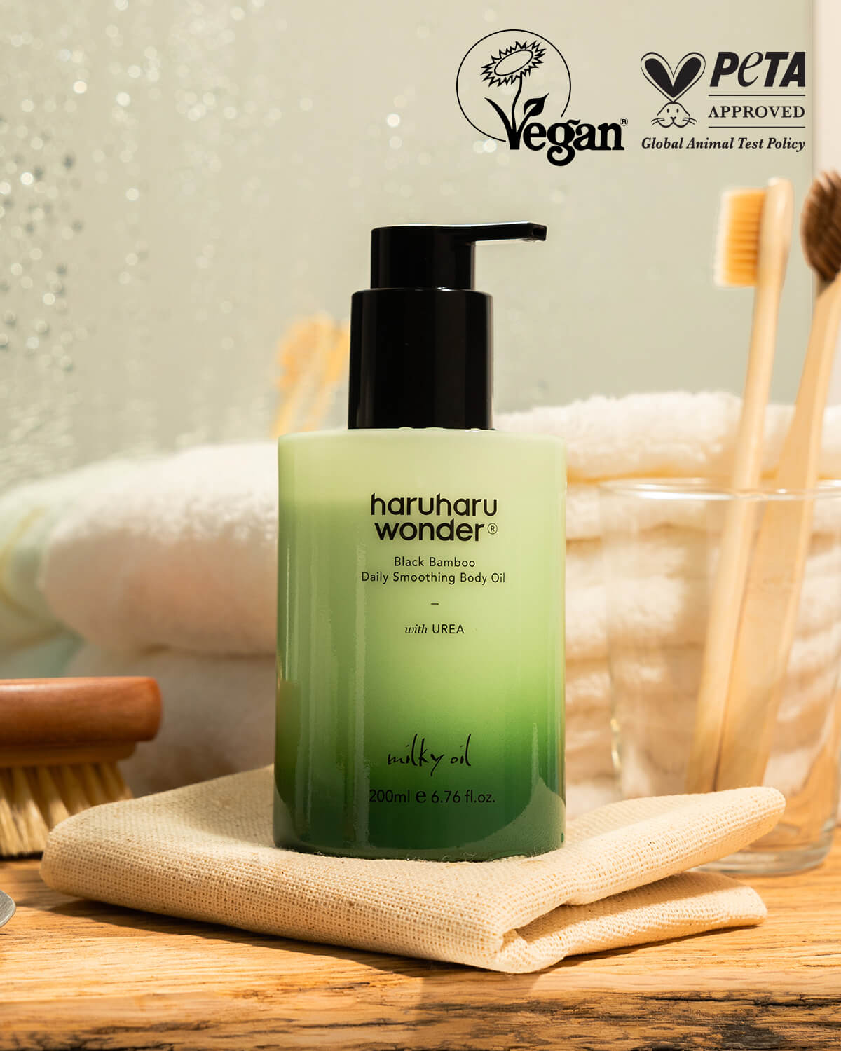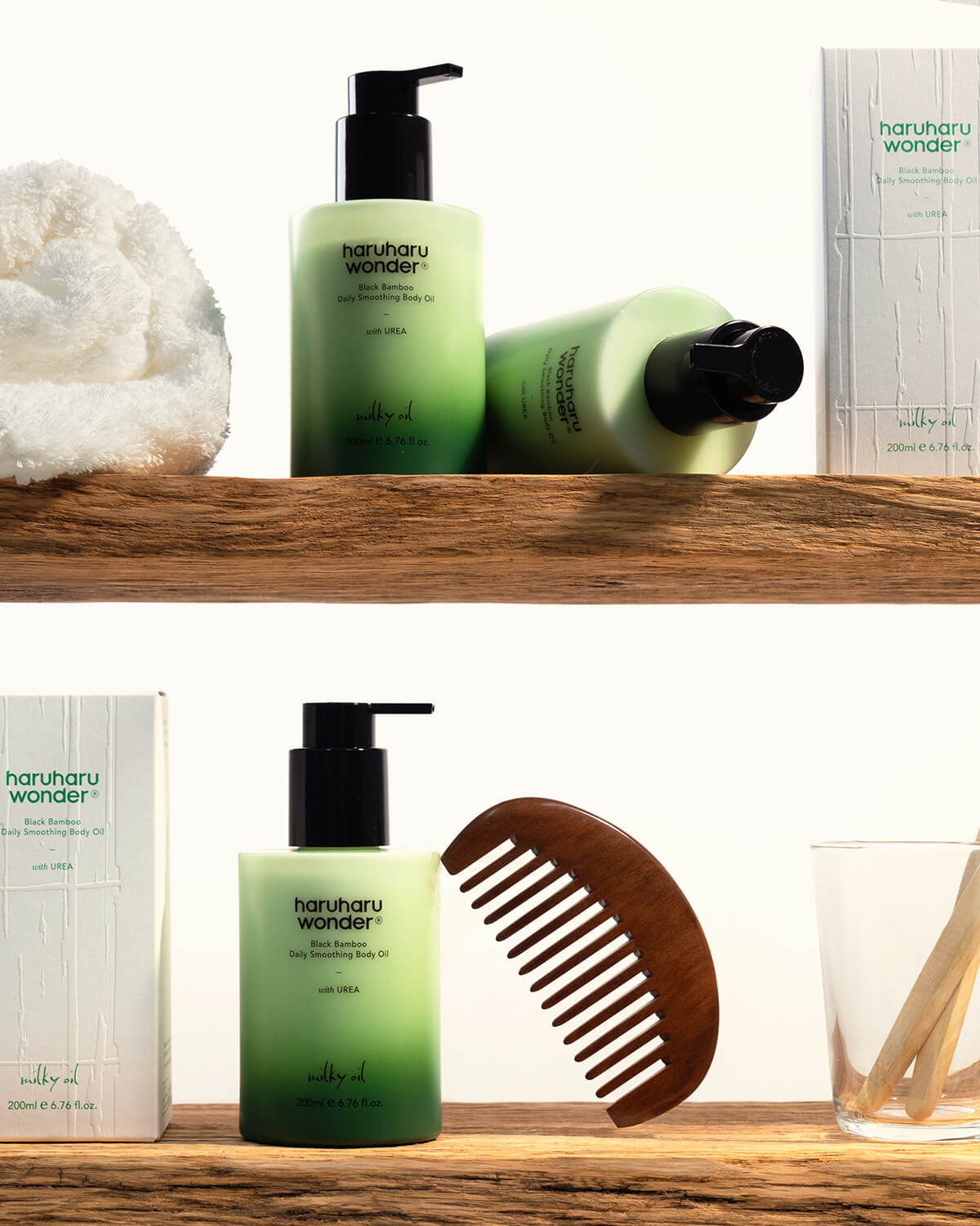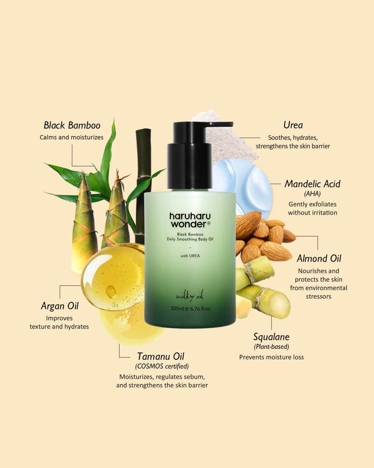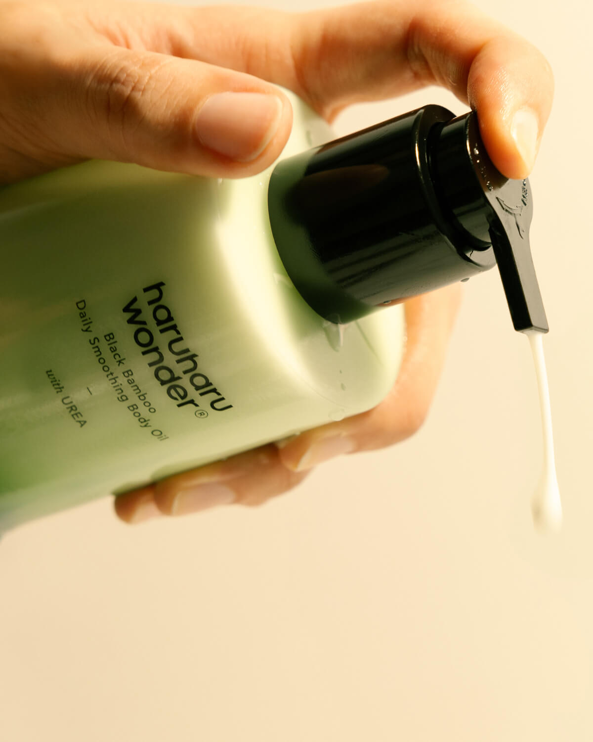 The haruharu wonder Black Bamboo Daily Smoothing Body Oil is a lightweight, milk-type oil that hydrates, exfoliates, and softens. Enriched with bamboo water, mandelic acid, and nourishing oils, it absorbs easily without feeling greasy or sticky