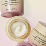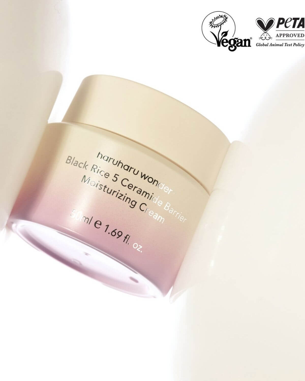 The haruharu wonder Black Rice 5 Ceramide Barrier Moisturizing Cream blends five types of encapsulated ceramides (NP, NS, AP, EOS, EOP) with fermented black rice to repair and fortify the skin barrier while delivering long-lasting moisture. The visible ceramide capsules melt into the skin for deep nourishment, while antioxidant-rich fermented black rice and upcycled black rice lees extract help soothe, brighten, and protect.