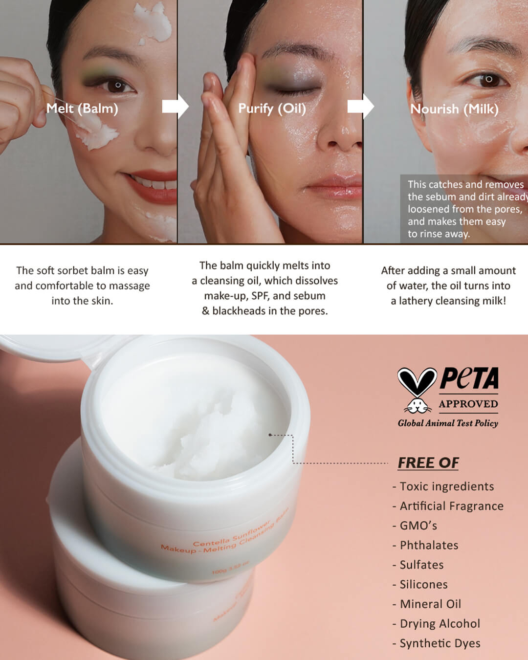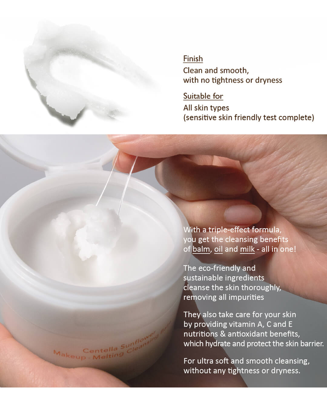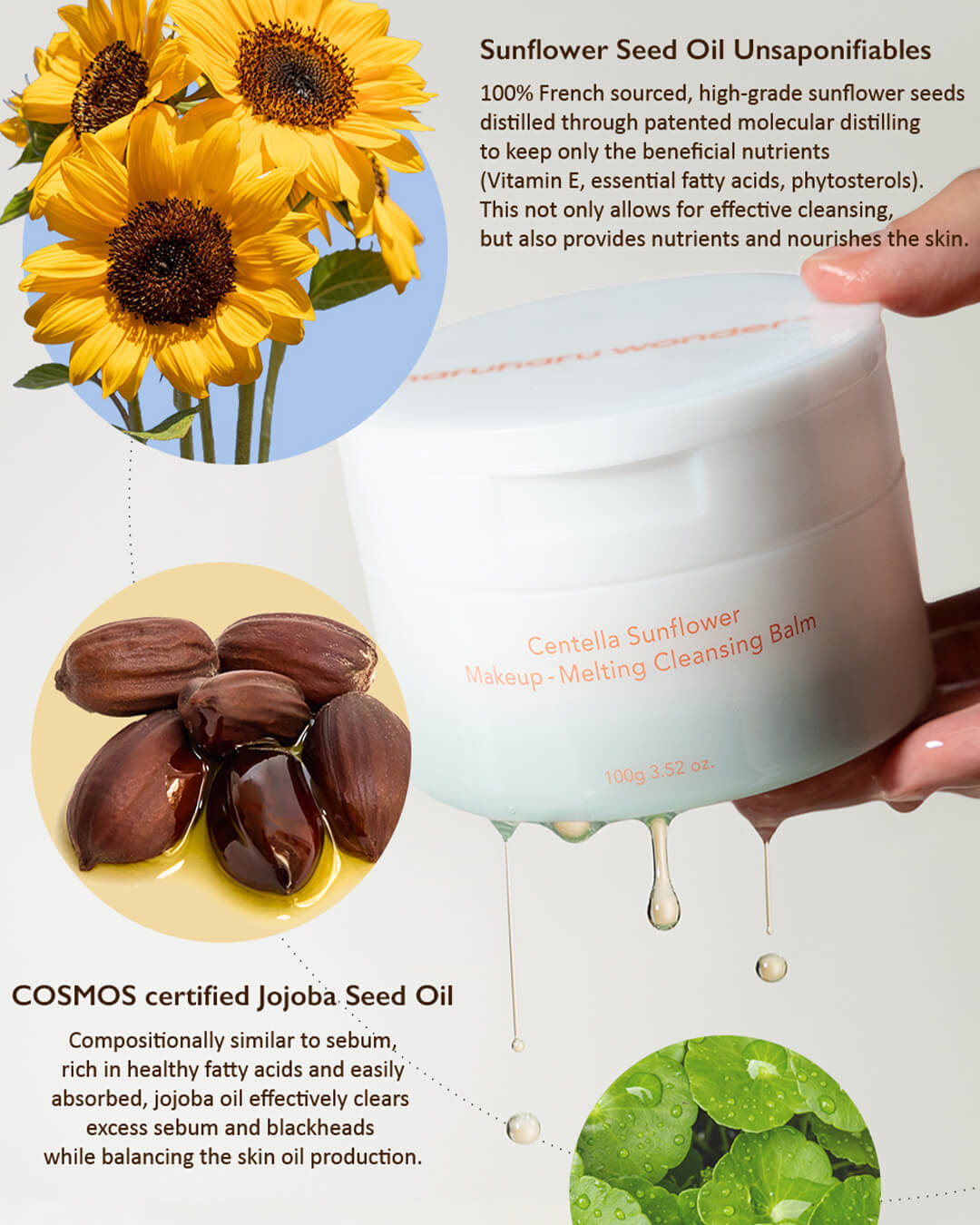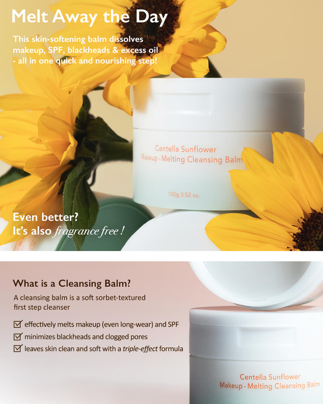 The Centella Sunflower Makeup-Melting Cleansing Balm dissolves makeup, SPF, blackheads & excess oil, all in one quick and nourishing step. Non-comedogenic. Zero residue.