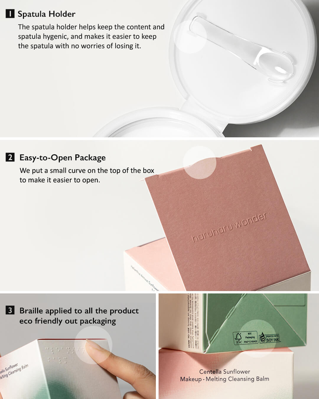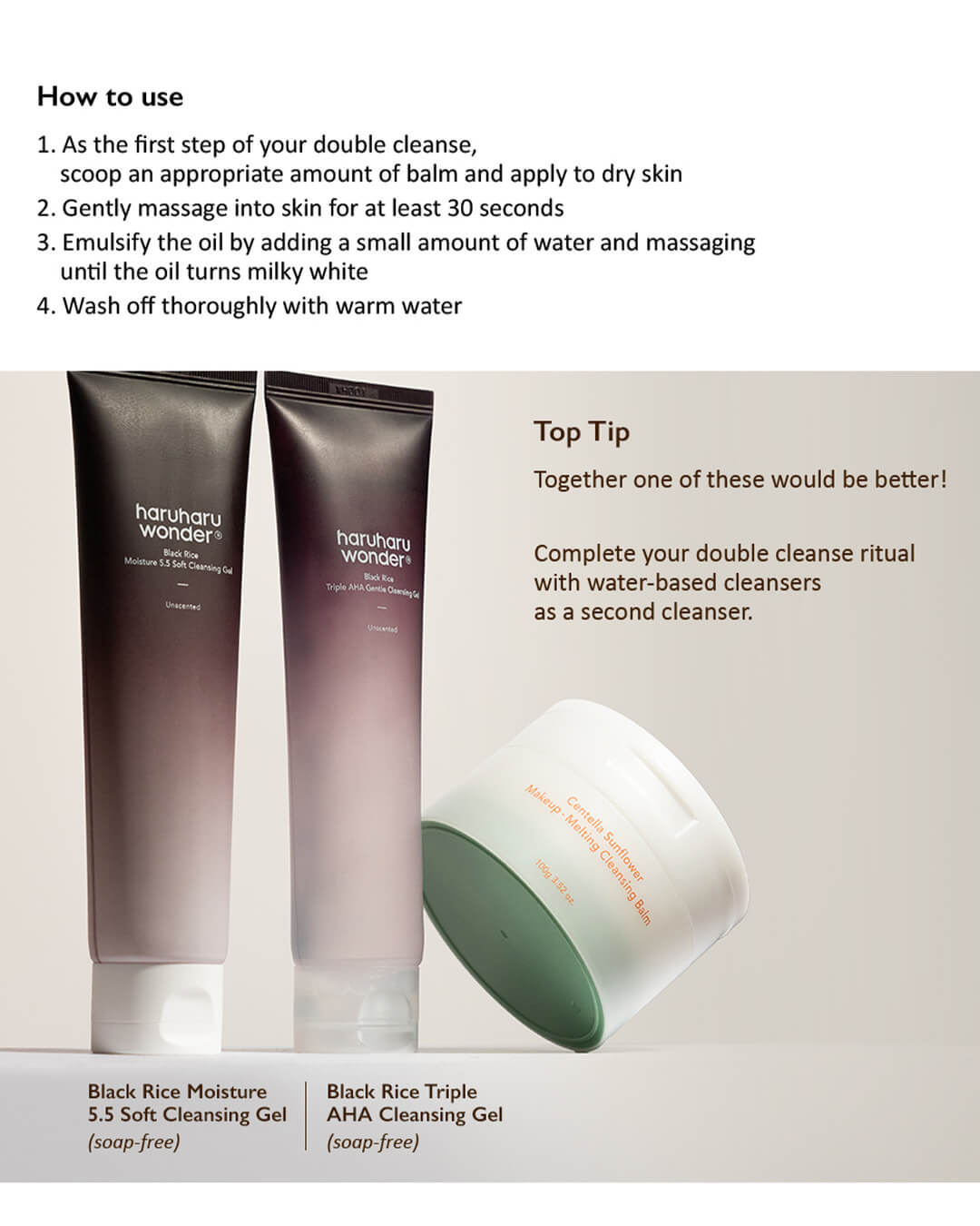 The HaruHaru Wonder Centella Sunflower Makeup-Melting Cleansing Balm melts to clarify and cleanse the skin while hydrating. Its star ingredient, sunflower seed oil, is 100% French-sourced and rich in vitamin E & essential fatty acids that nourish and strengthen the skin. It starts as a sorbet-textured, smooth balm that melts dirt, SPF, makeup, and environmental stressors from the day. As it warms into the skin, it turns into an oil that purifies and dissolves clogged pores & removes excess sebum. Once water is added, it transforms once again into a nourishing milk that cleanses and clarifies. Its fragrance-free, gentle formula is perfect for all skin types, even the most sensitive.