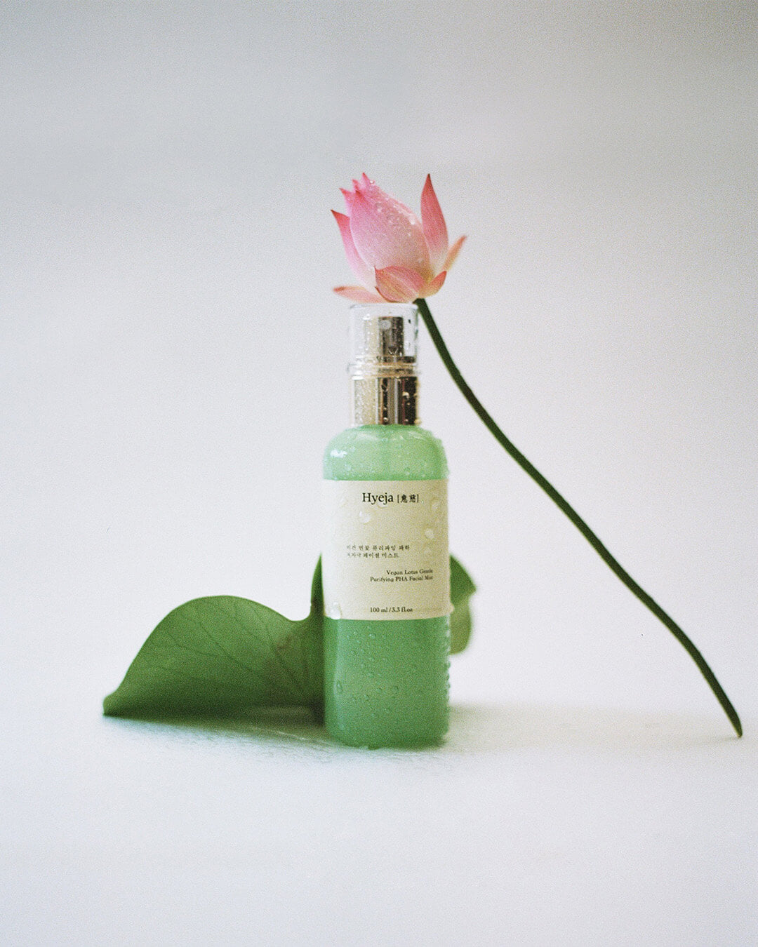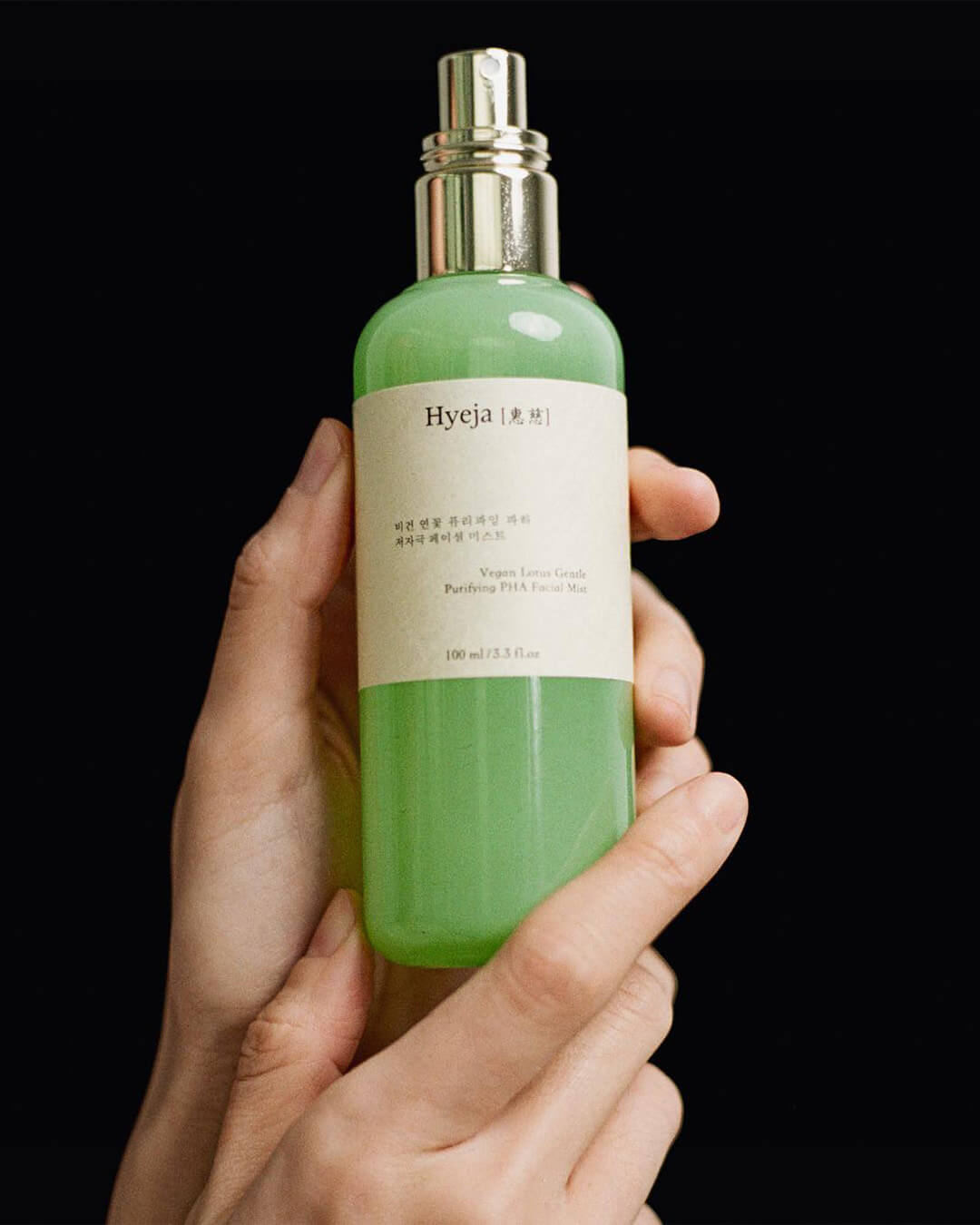 Hyeja’s Vegan Lotus Gentle Purifying PHA Facial Mist is a gently exfoliating, revitalizing daily toner that leaves skin refreshed, glowing, and visibly smoother.
