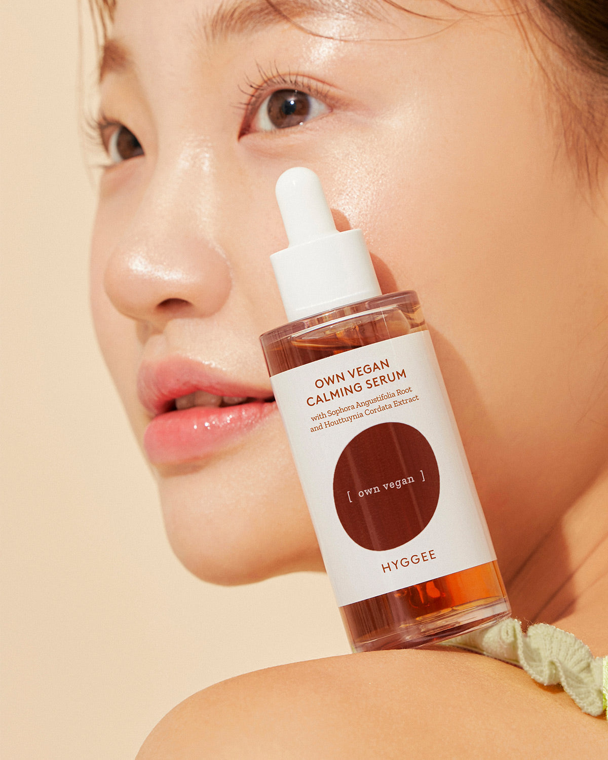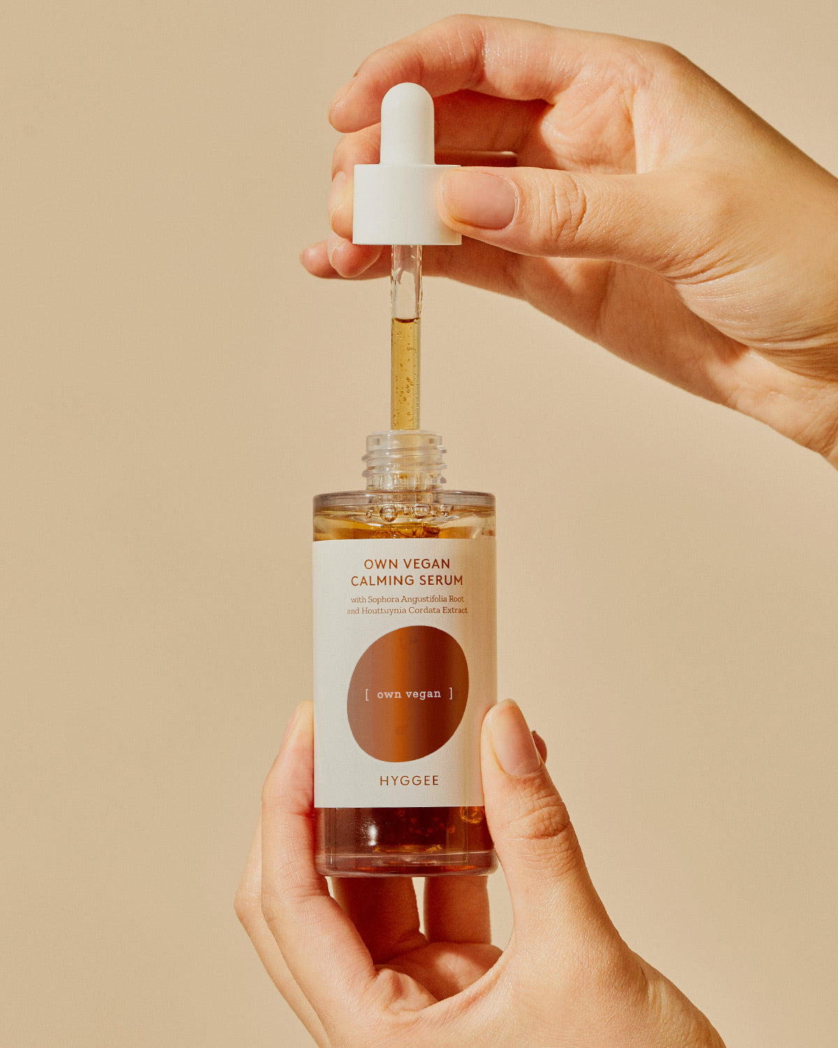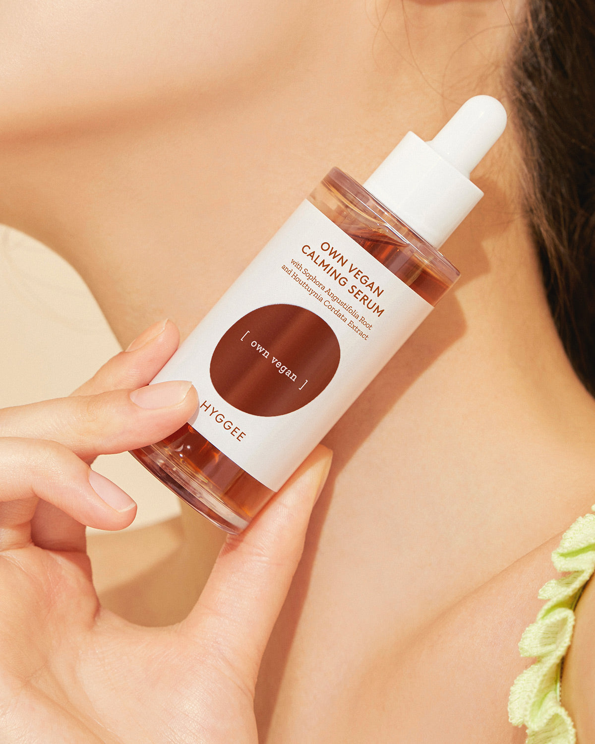 The Hyggee Own Vegan Calming Serum is enriched with 203,700ppm of Jeju shrubby sophora extract and houttuynia cordata extract to provide an instant soothing effect.