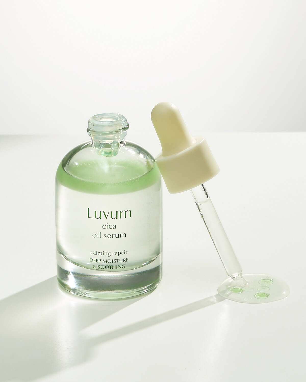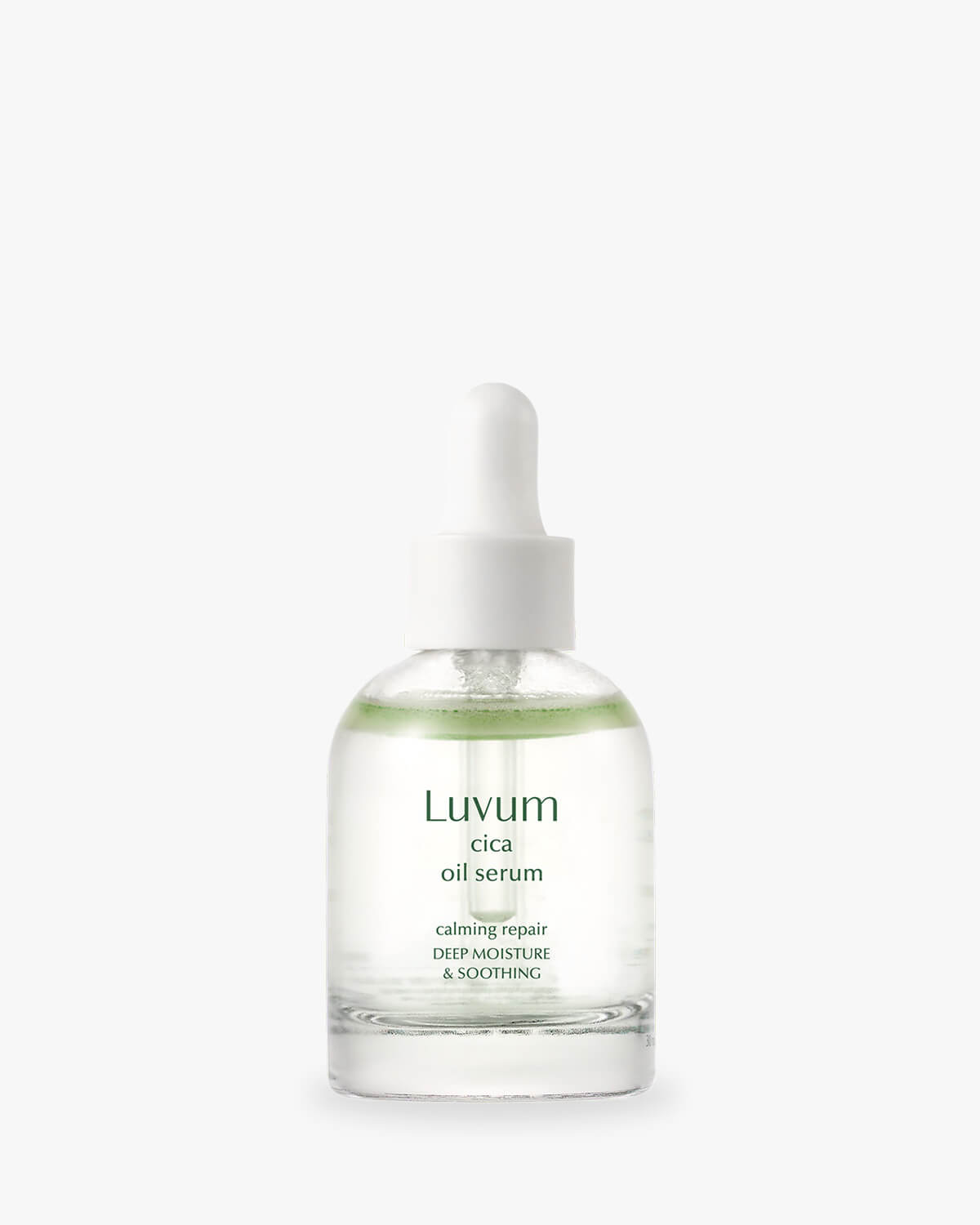 The Luvum Calming Repair Cica Oil Serum contains a combination of deeply calming and hydrating ingredients to repair and hydrate, while minimizing irritation and redness. Top grade young centella asiatica and madecassoside calm and repair. Cork tree extract and coconut oil protect and moisturize. Clinically tested to be gentle, non-irritating, and non-comedogenic, suitable for sensitive and acne-prone skin.