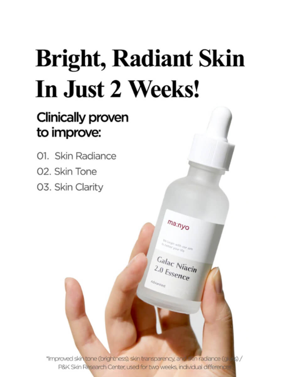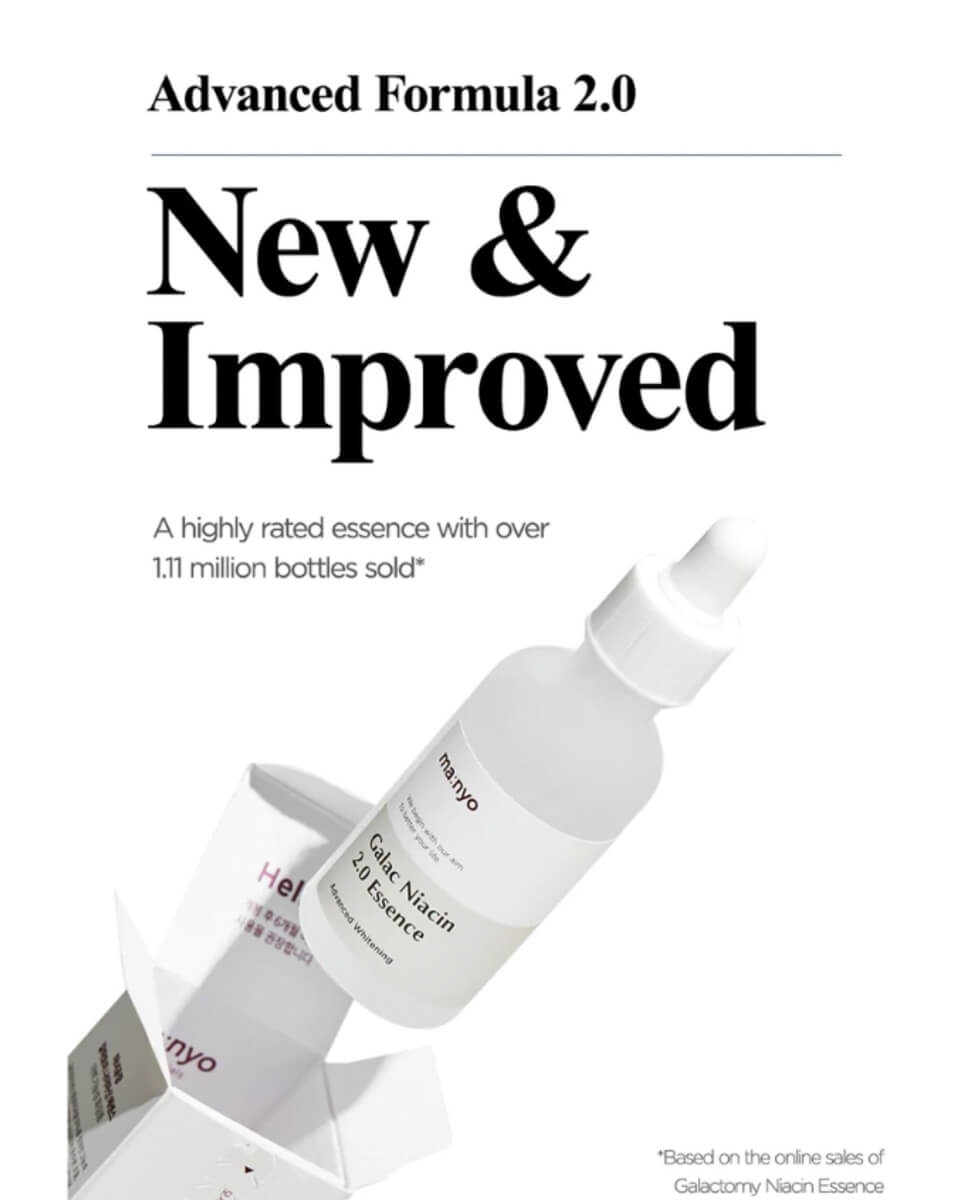 ma:nyo's all-time best seller! Galac Niacin 2.0 Essence is suitable for all skin types to boost radiance, even out skin texture, and enhance moisture for a brighter complexion. Utilizing star ingredients such as vitamin-rich galactomyces fermentation filtrate and fortifying niacinamide, this essence removes dead skin cells while keeping the skin hydrated and firm.