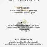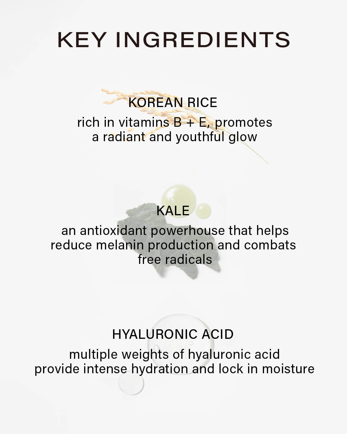 Powered by Korean rice extract and hyaluronic acid, it hydrates deeply while niacinamide brightens and basil oil calms stressed skin.
