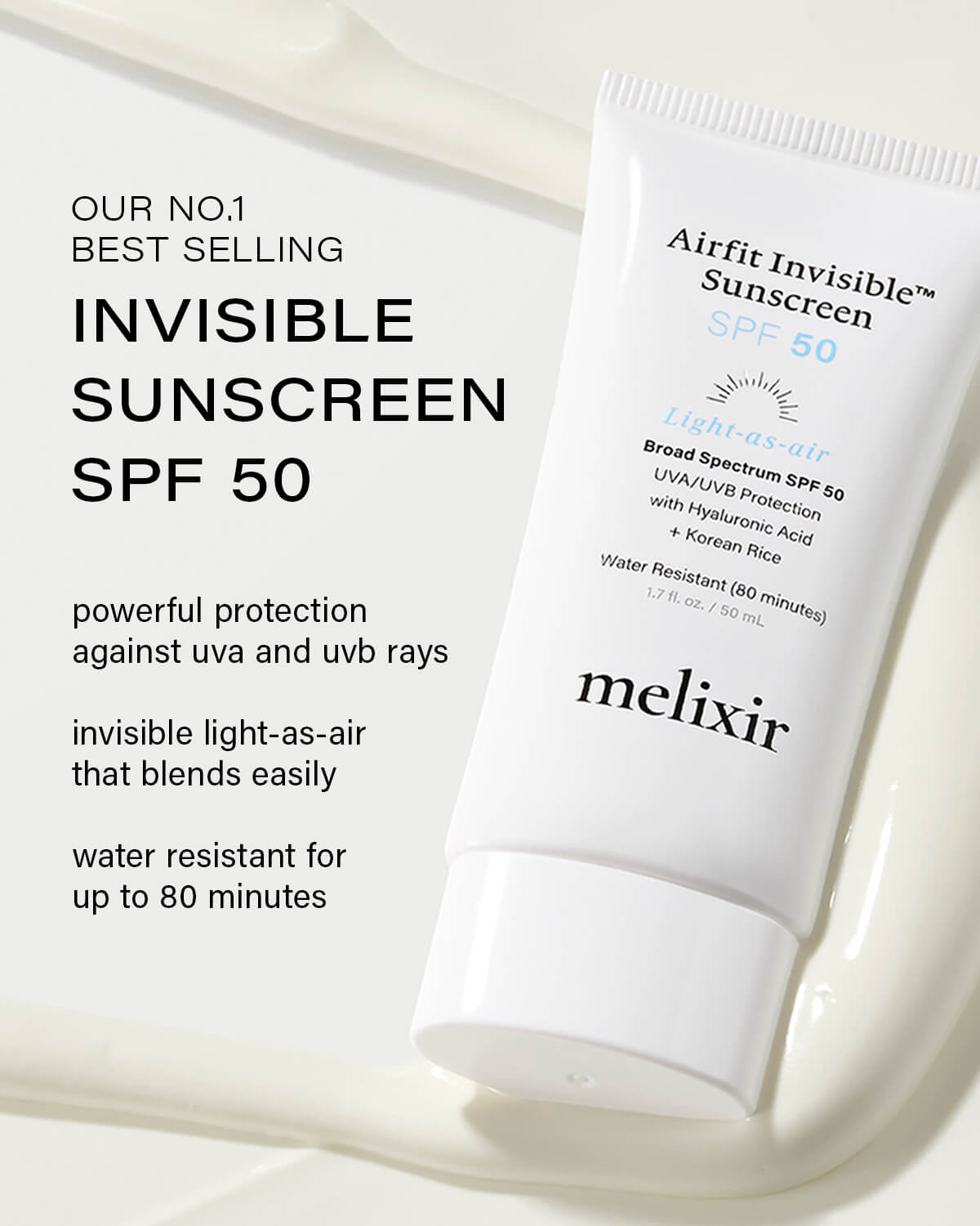 Melixir’s Airfit Invisible™ Sunscreen is the ultimate two-in-one: a soothing daily moisturizer and high-performance sunscreen that’s ideal for everyday wear. The clean, chemical-based formula is free of Phenoxyethanol, Phthalates, Parabens, Silicones, and Sulfates, plus it’s dermatologist-tested for sensitive skin. It glides on like a lightweight lotion and blends invisibly on all skin tones—no white cast, no stickiness.
