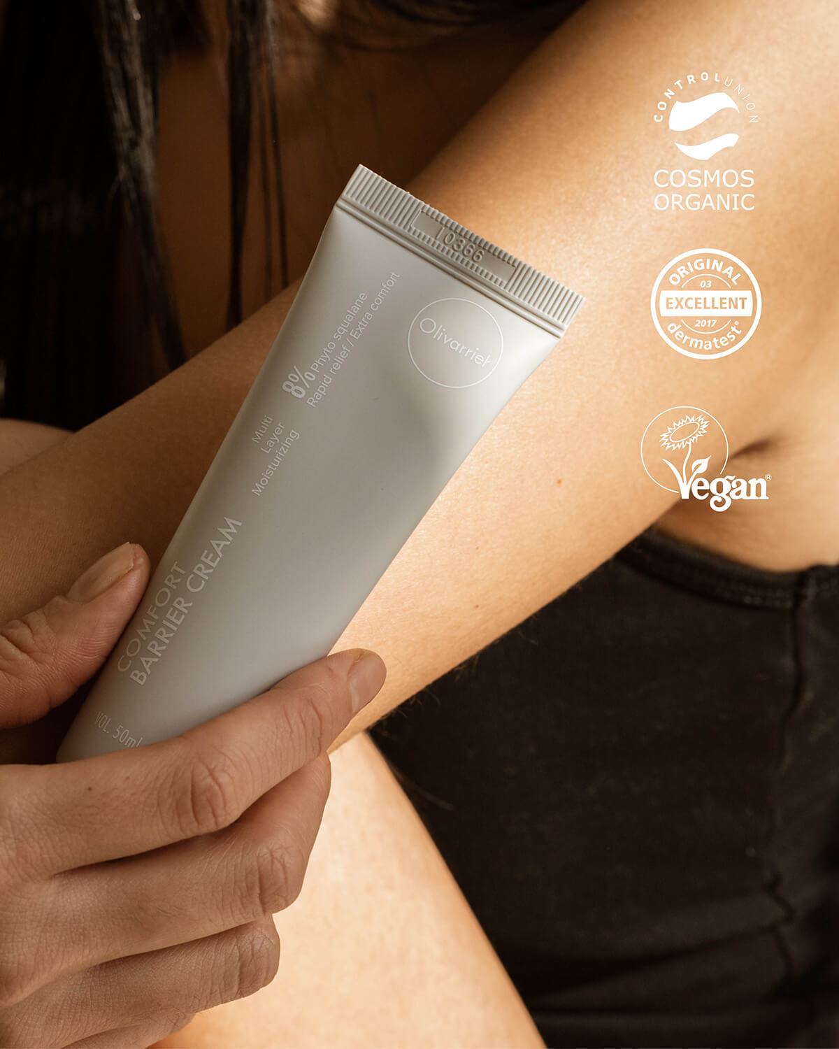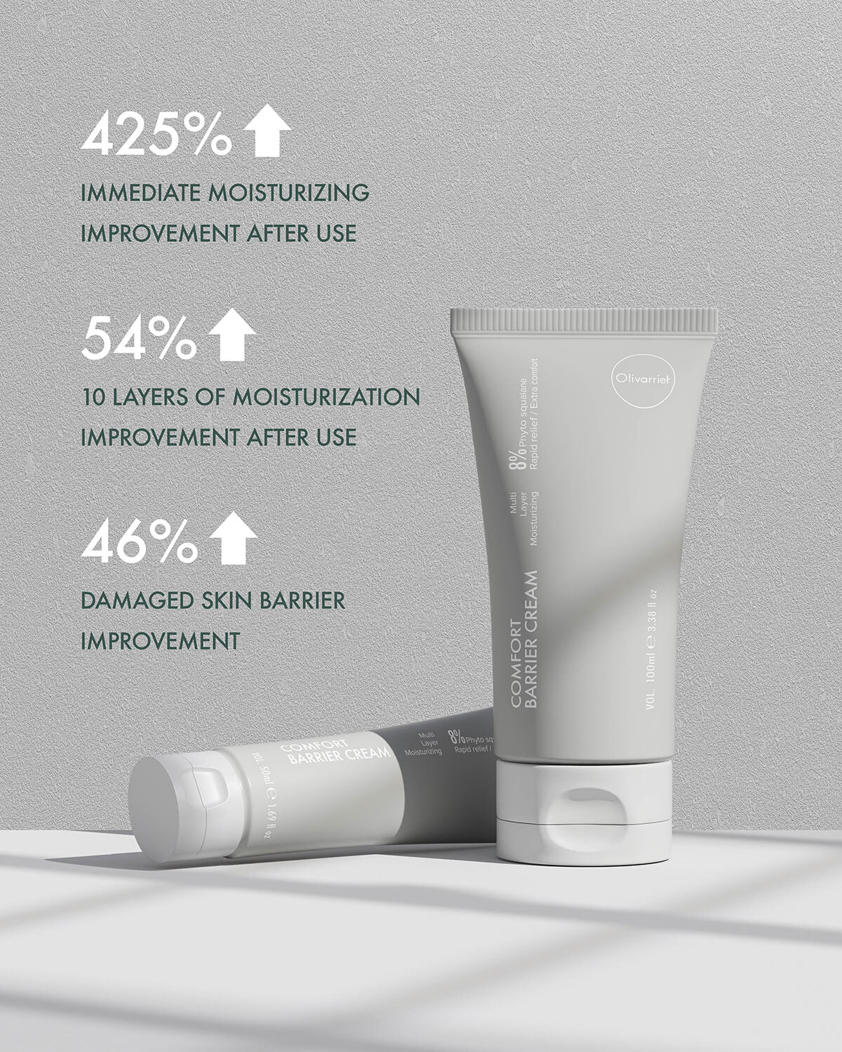 Olivarrier's Comfort Barrier Cream moisturizes ten layers deep into the skin to nourish and strengthen the skin barrier. Encapsulated organic glycerin, ceramides and micro hyaluronic acid hydrate, protect and prevent moisture loss. Added squalane and fatty acids help to repair damage from the environment, such as pollution and free radicals. Brightening Yuja water and regenerating sea buckthorn extract calm irritation, promote elasticity and prevent acne-causing bacteria. Skin is noticeably softer, moisturized and more balanced.