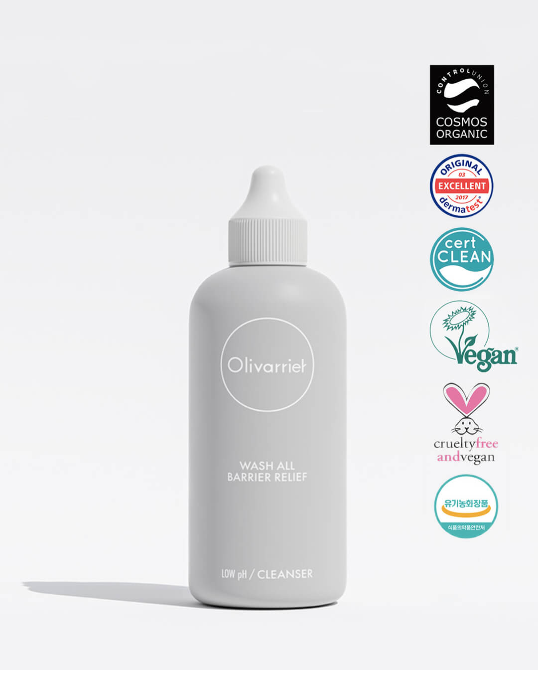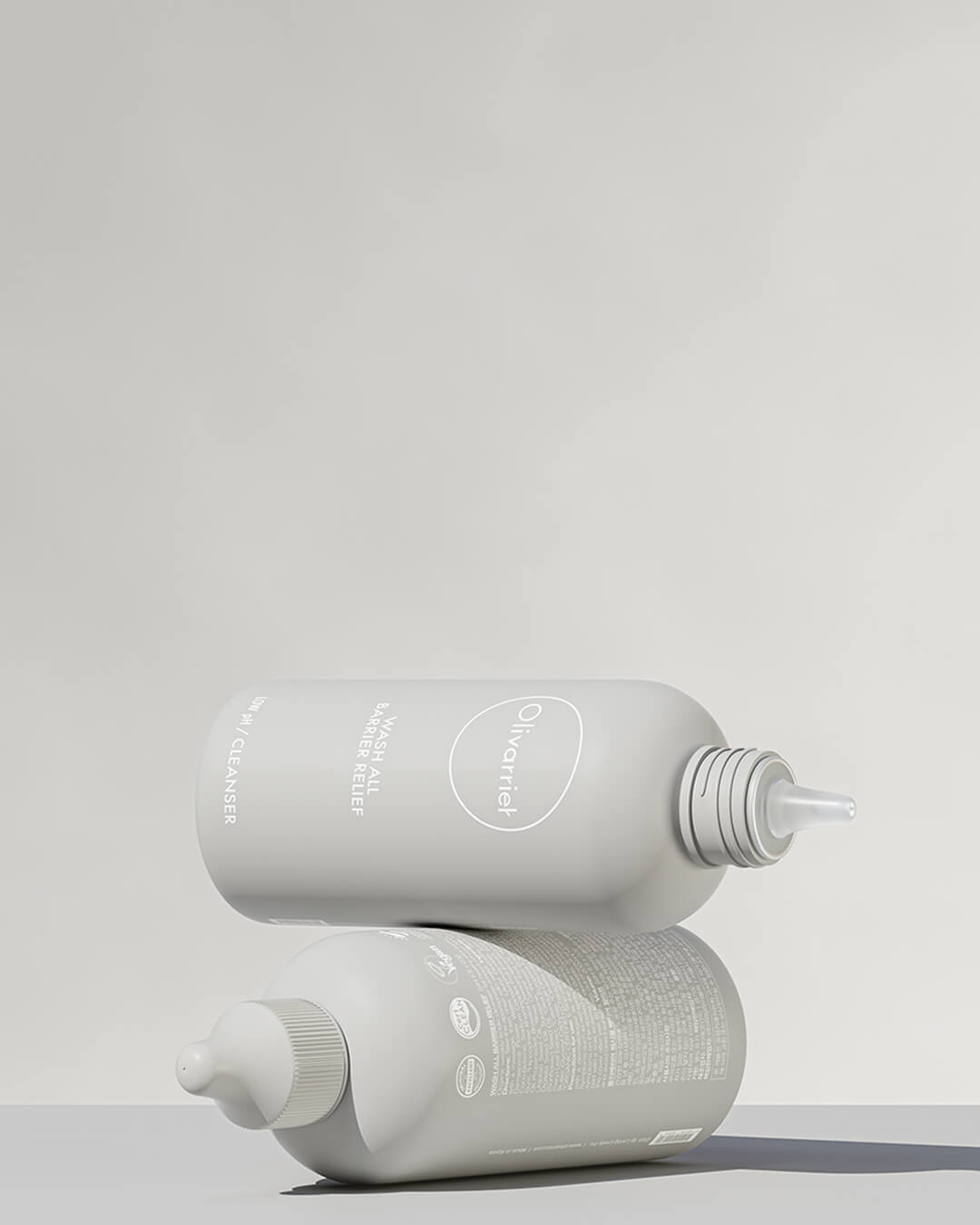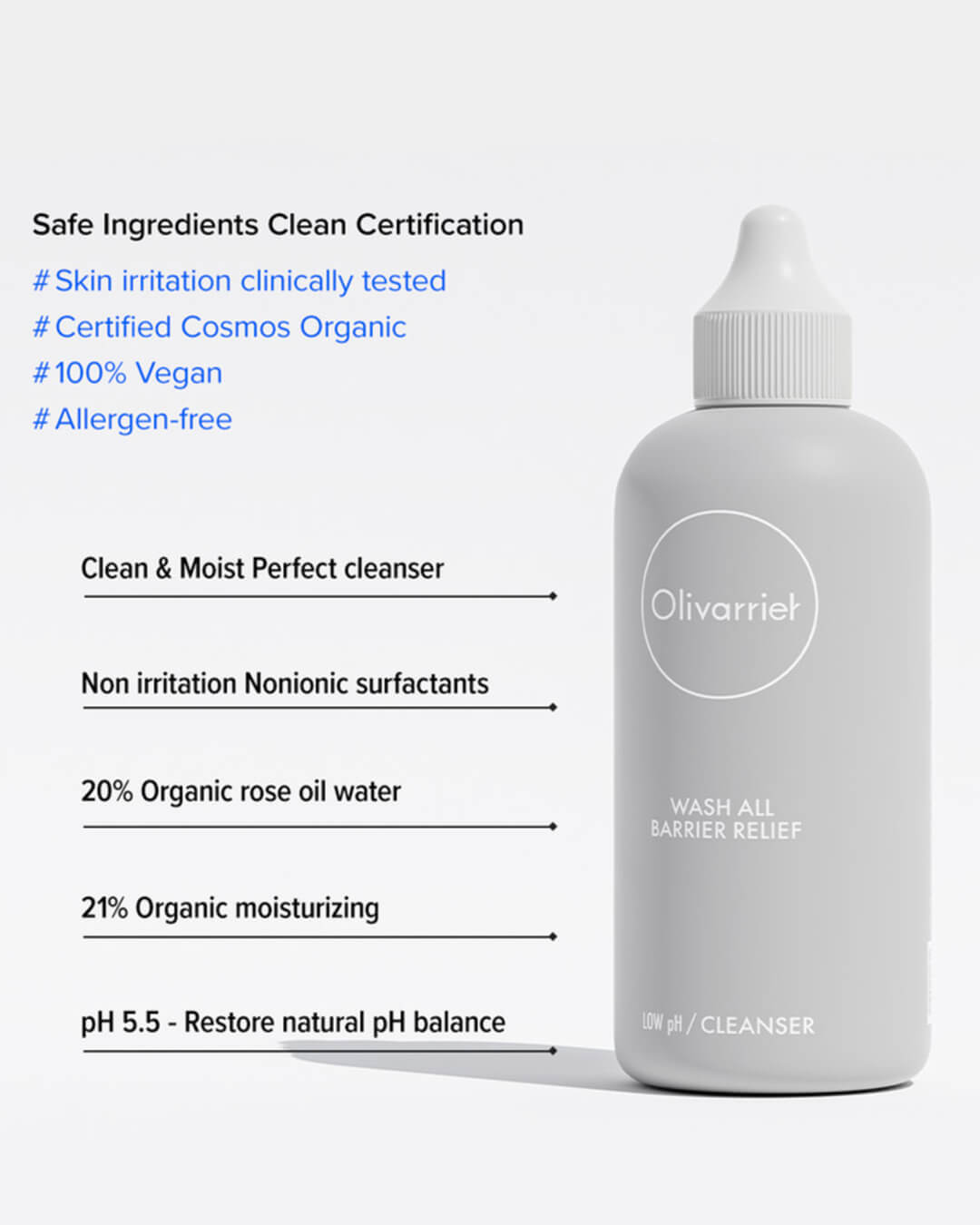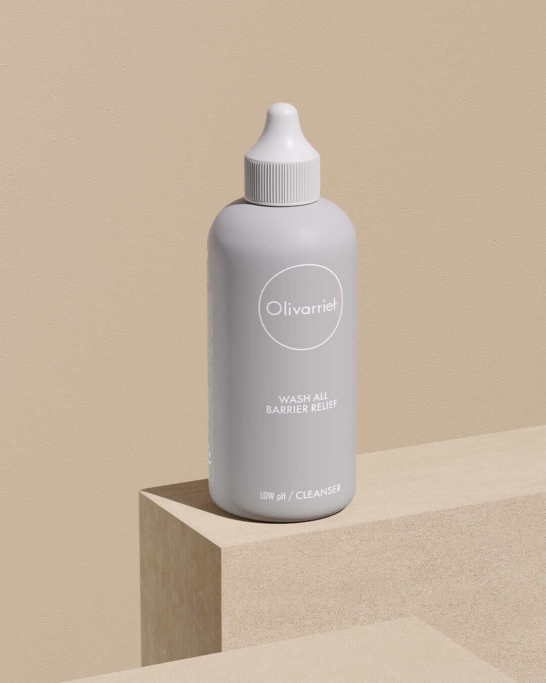 Take everything off in one simple step. The Olivarrier Wash All Barrier Relief Cleanser is a triple action (makeup remover, foam and moisture booster) cleanser that generates tiny micro-bubbles to remove sunscreen, makeup and deeply clean pores. With a mildly acidic/low pH of 5.5, it won't disturb the skin's delicate acid mantle (moisture barrier) as it lifts and dissolves impurities. Instead, cleansed skin is left hydrated and intact, not dried out. Eight plant-based, cold-pressed, organic oils (avocado, rose hip, broccoli seed, jojoba seed, sunflower seed, tomato seed, baobab and argan) richly nourish the skin with a concentrated dose of vitamins. Vegan ceramide, which mimics the lamellar (lipid) layer found in the skin, quickly absorbs to strengthen the skin's barrier without chemical solvents. Organic rose water further calms and hydrates.