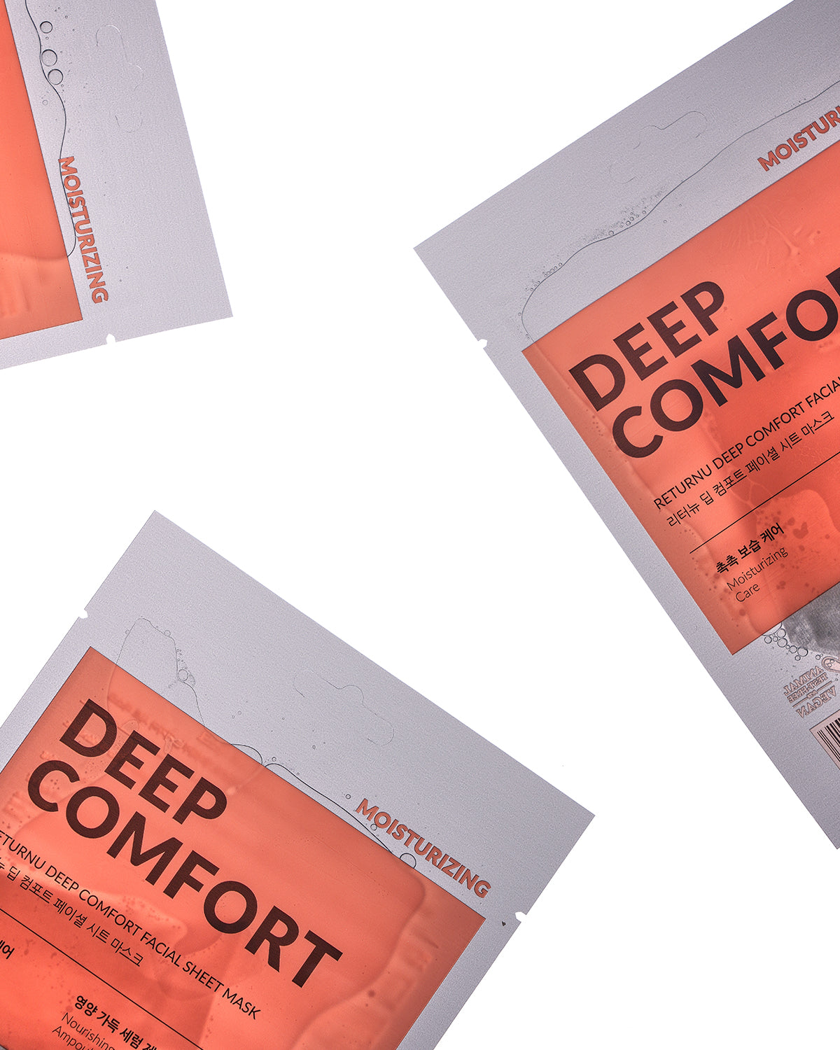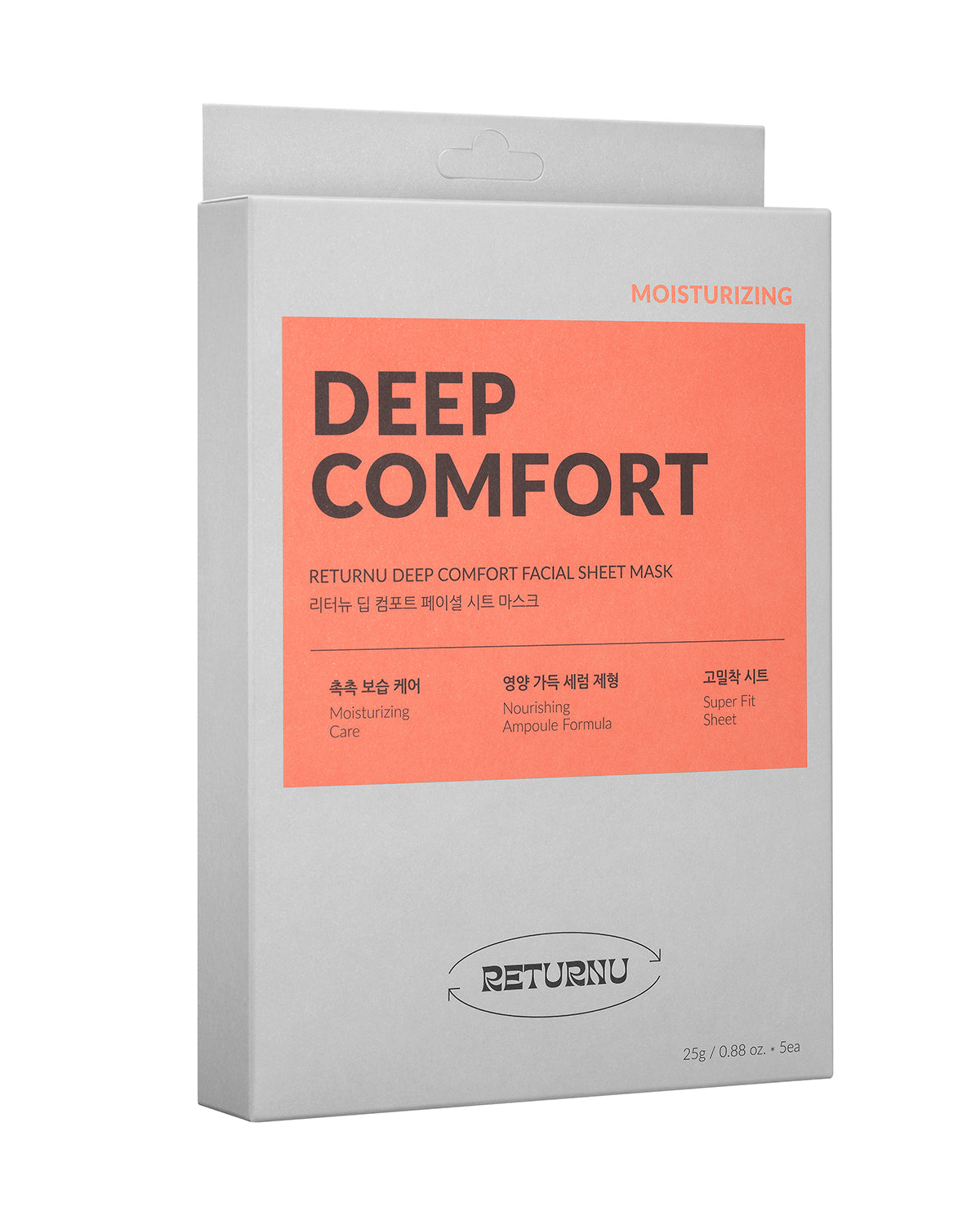 The Returnu Deep Comfort Facial Sheet Mask is an intensely moisturizing mask infused with panthenol, ceramides, and Korean birch sap to deeply hydrate, strengthen the skin barrier, and provide long-lasting nourishment for all skin types.