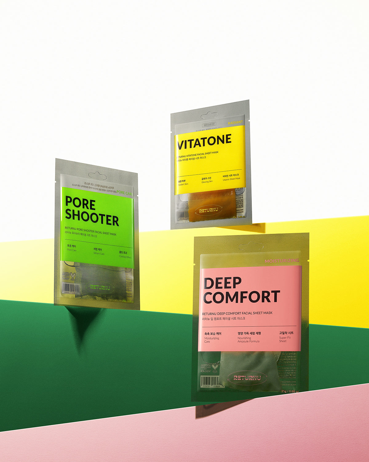 The Returnu Pore Shooter Facial Sheet Mask provides an instant cooling effect with non-menthol ingredients, clinically proven to lower skin temperature by 6.36°C without irritation. Formulated with persimmon leaf and tannin complex, it effectively reduces sebum by 35.45% and minimizes pore depth by 17.06%, helping to refine skin texture and control shine.