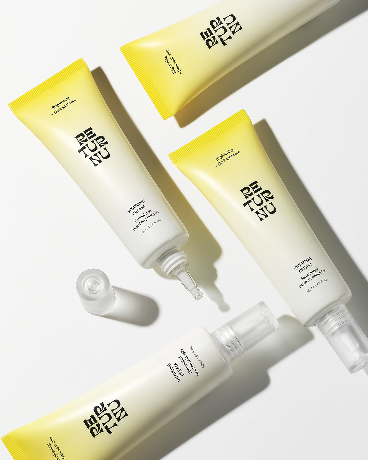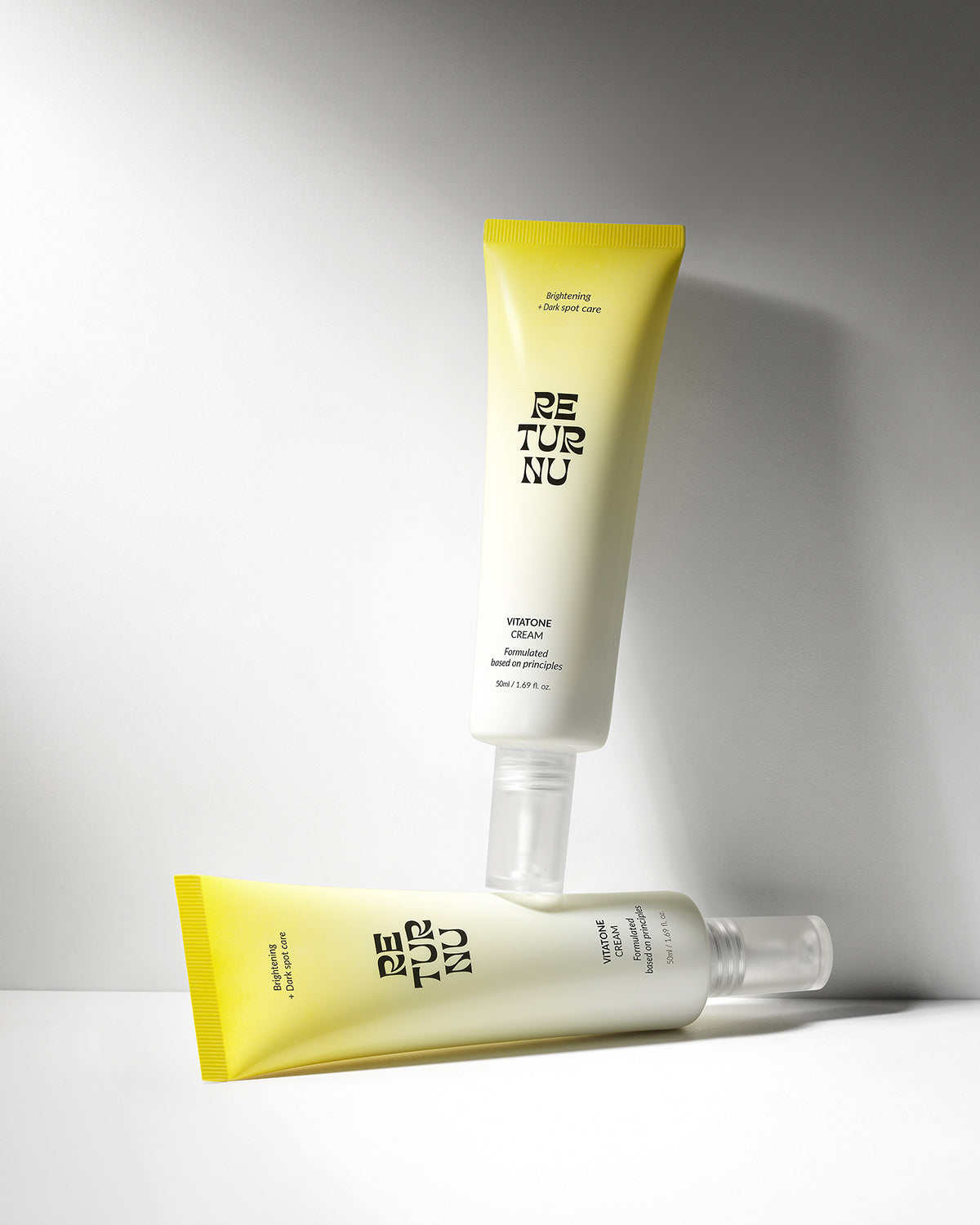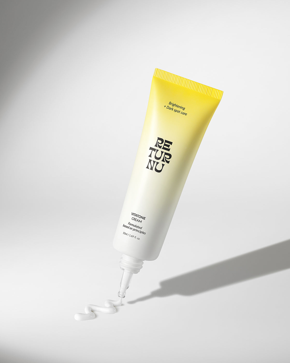 The Returnu Vitatone Cream is powered by a 3-Step Brightening System designed to target discoloration at every stage. Jeju green tangerine and vitamin C form a protective barrier against dark spots, while niacinamide helps prevent melanin transfer, and glutathione works to inhibit blemishes for a visibly clear and glowing complexion.