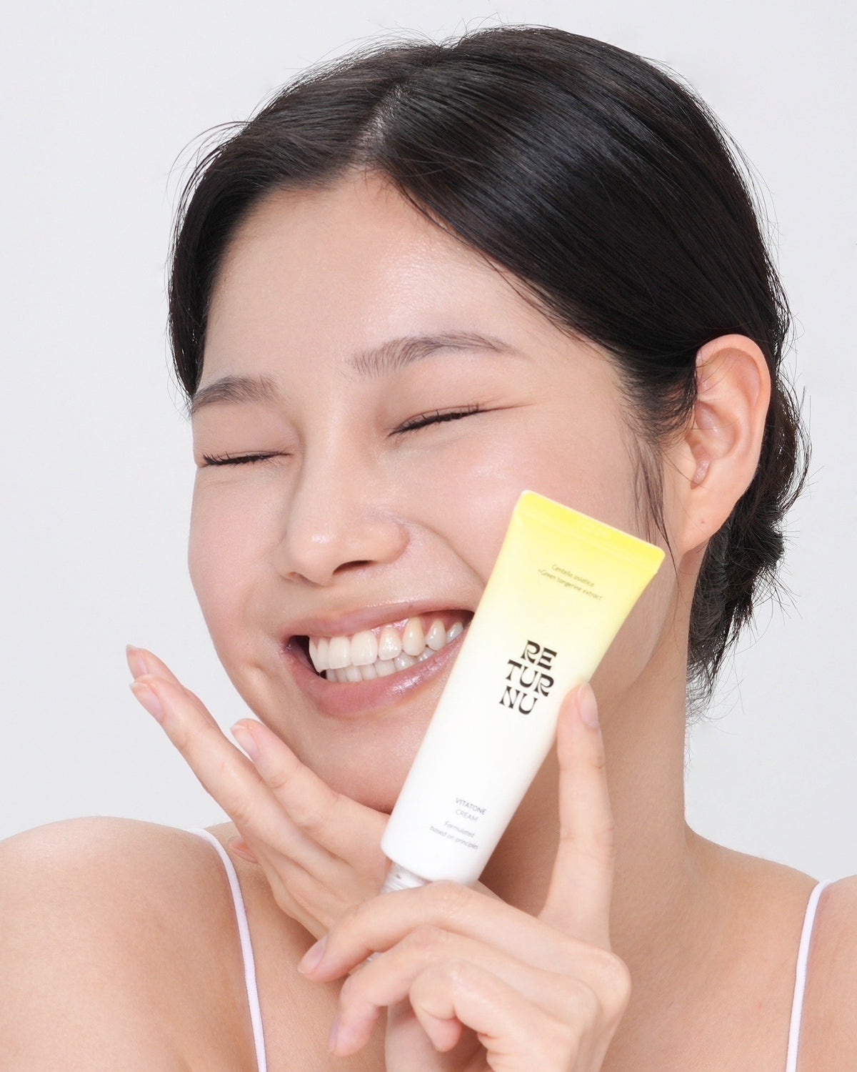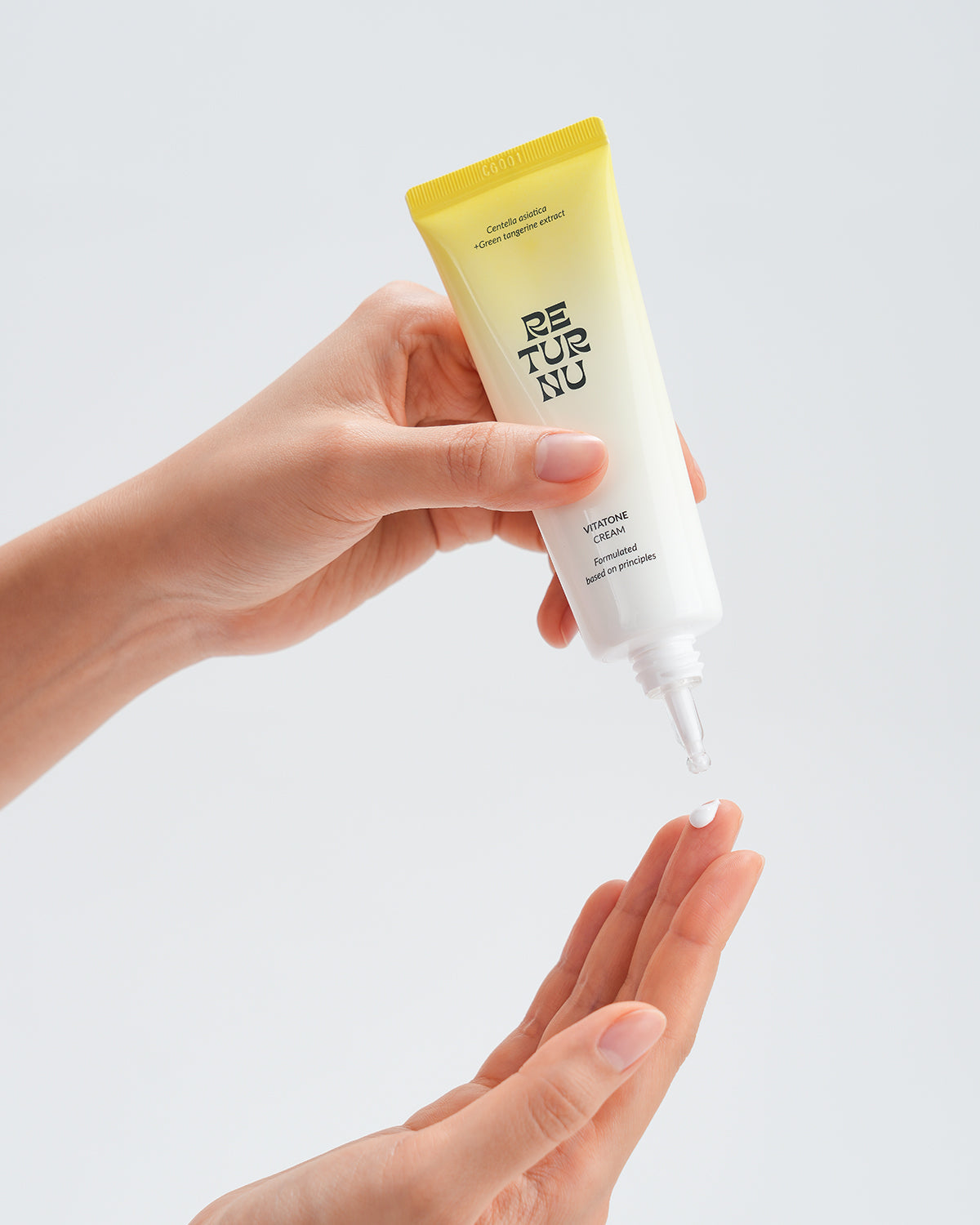 The Returnu Vitatone Cream is a lightweight daily moisturizer infused with Jeju green tangerine, vitamin C, and niacinamide to brighten, hydrate, and even out skin tone for a glowing complexion. Its refreshing texture absorbs quickly without stickiness, leaving skin smooth and luminous.