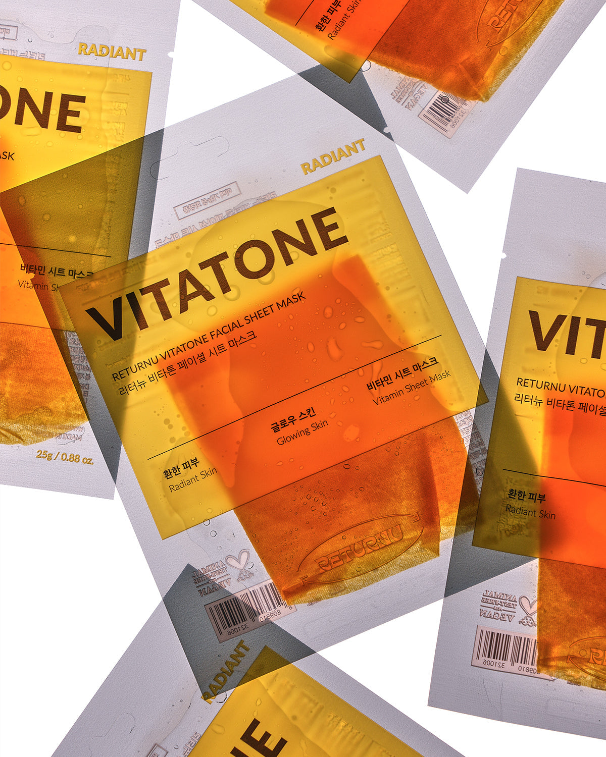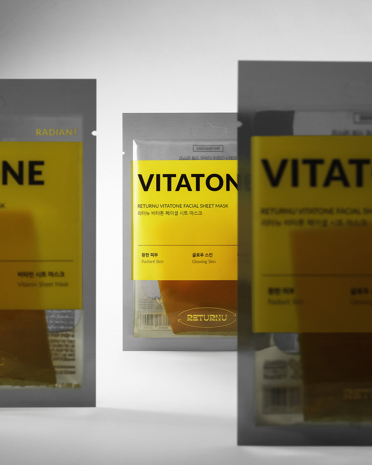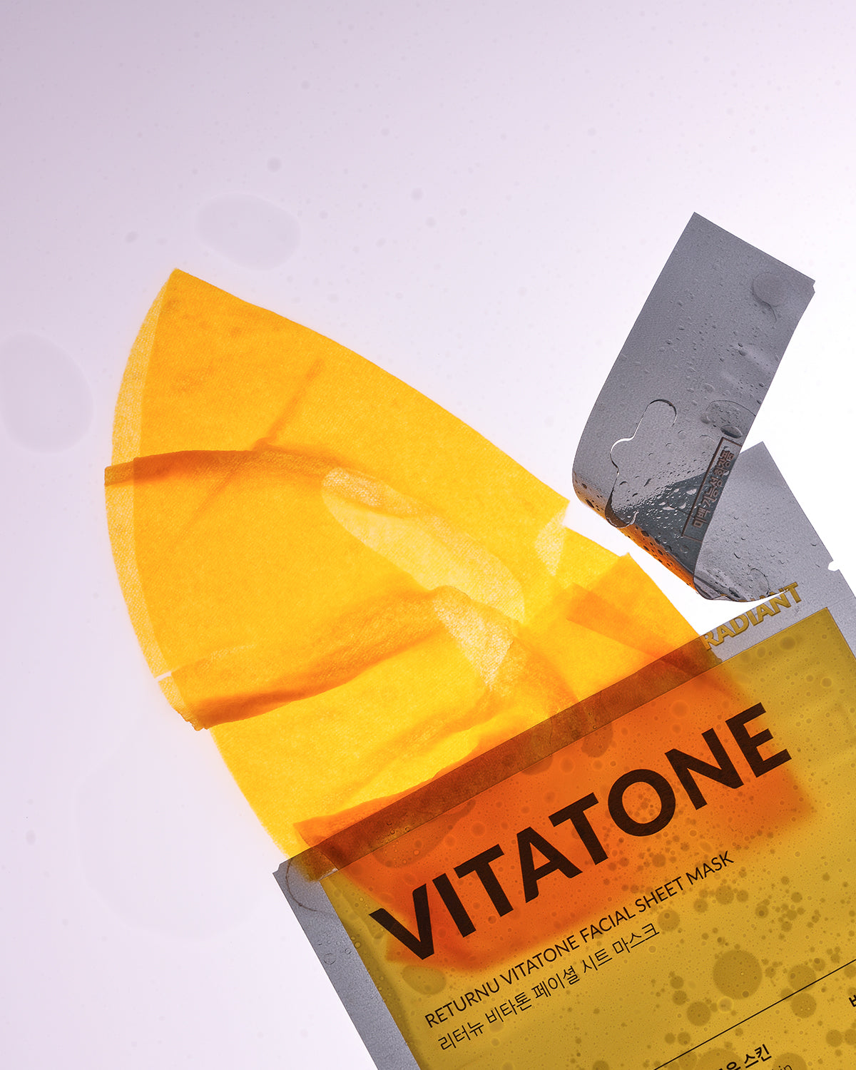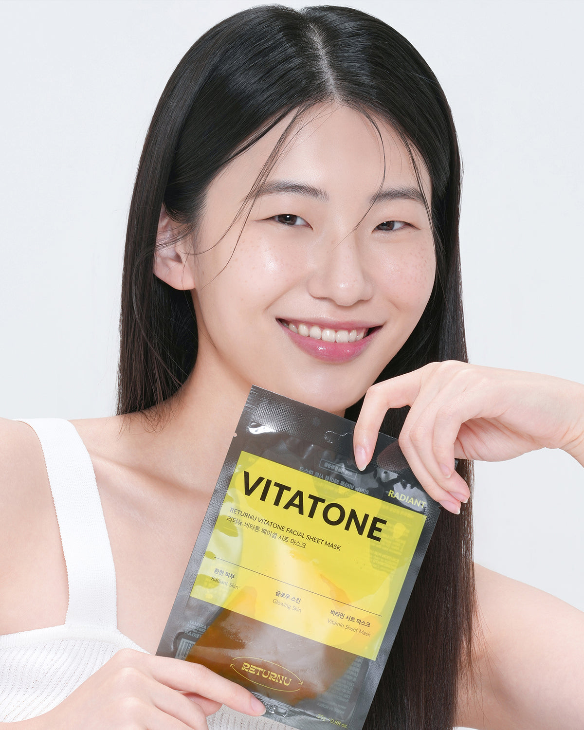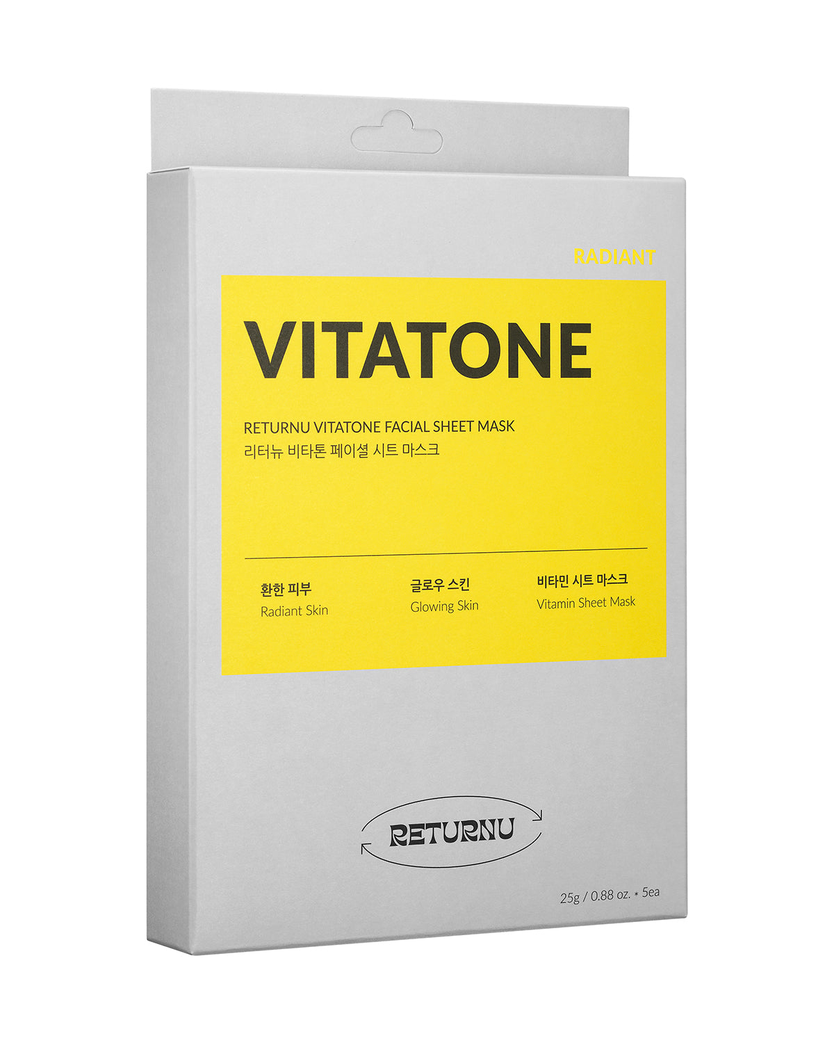 The Returnu Vitatone Facial Sheet Mask is a lightweight, glow-enhancing mask infused with real vitamin C coating, Jeju green tangerine, and niacinamide to brighten skin, improve tone, and deliver deep hydration for a dewy, luminous complexion.