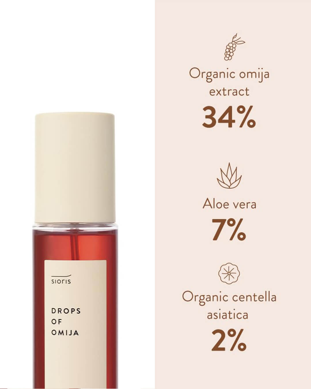 An ultra soothing mist perfect for maintaining balance and glow to the skin. Made with 34% organic Omija, Sioris's new calming mist is rich in polyphenols for redness reduction and skin-calming benefits. Zinc PCA and beta-glucan boost hydration, control excess sebum production, while working with the formula’s slightly acidic pH level to help to balance the skin's oil:water ratio. Aloe vera and centella asiatica provide additional calming properties. Similar to the Omija Ampoule, this mist is great for calming and rejuvenating skin for a balanced, refreshed glow for all skin types. This product is vegan, cruelty-free, and packaged using eco-friendly materials printed with soy ink.