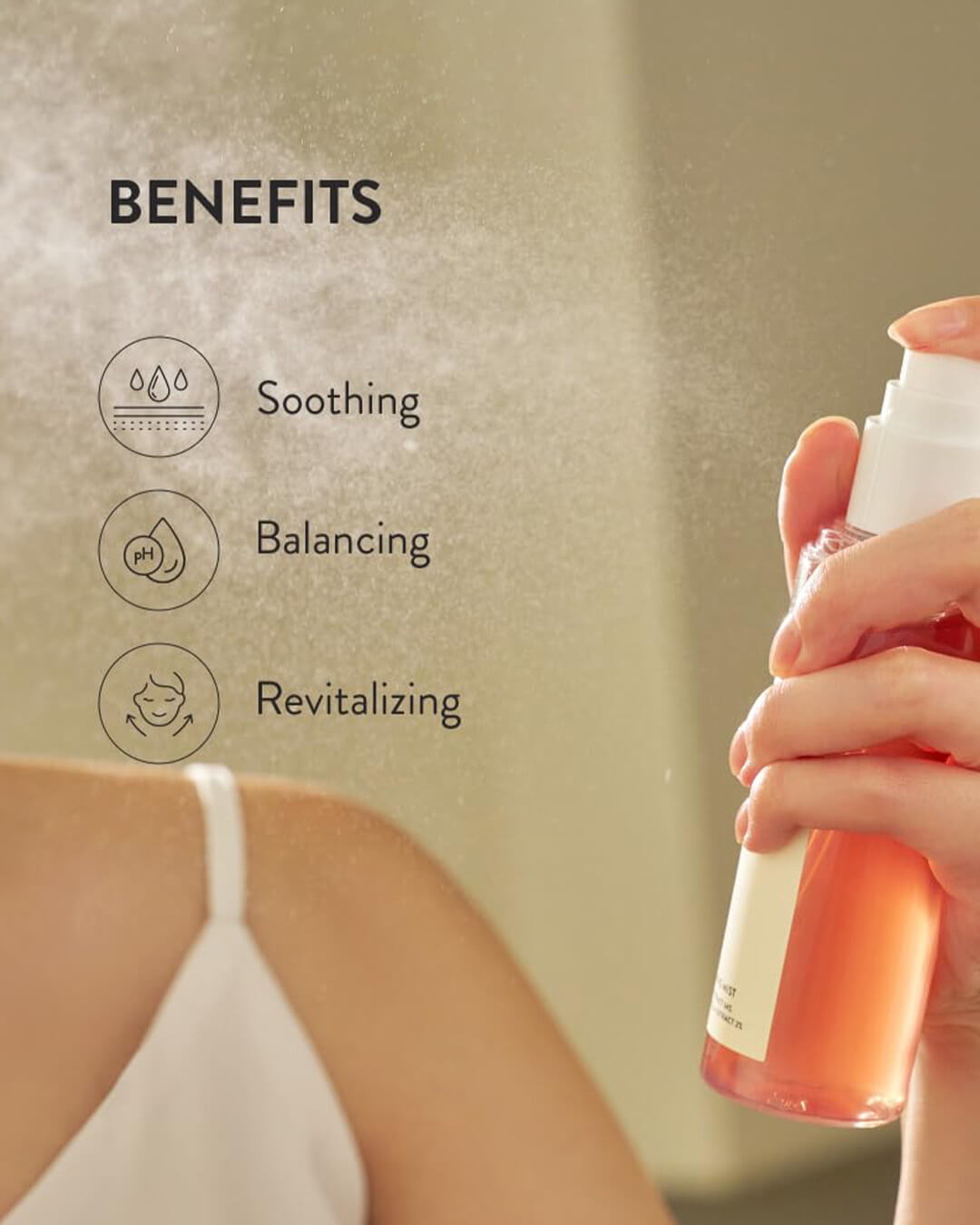 Pro Tip: Spritz to dampen a cotton pad and use as a 5-minute soothing mask pack on the face.