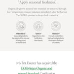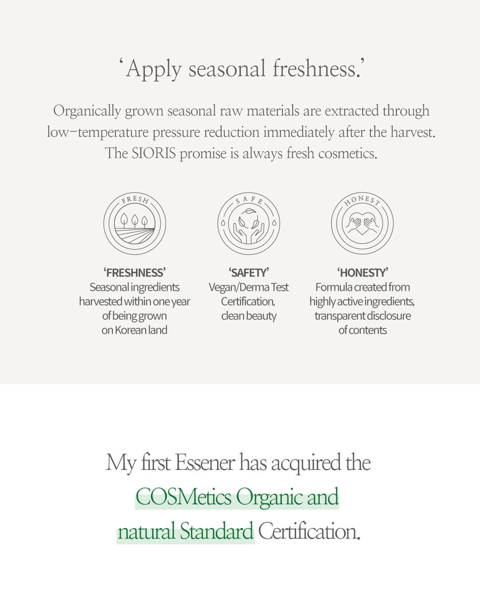 Certified organic by the COSMOS & vegan by The Vegan Society. Raw ingredients are harvested seasonally and purchased from organic farms in Gwangyang, Jeju Island and Mungyeong. This is a 100% natural and cruelty-free product, formulated without parabens, artificial fragrance, additives or harmful chemicals.