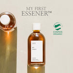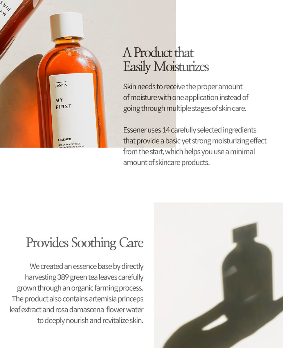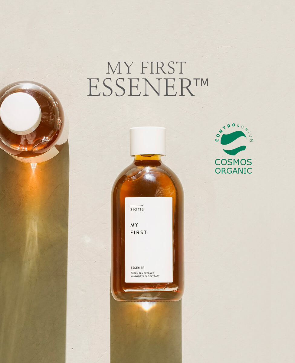 Sioris' My First Essener combines the hydrating properties of a toner with the nourishing properties of an essence in one "essener" formula. Organic green tea water (47.5%), high in antioxidant catechins and Vitamin B, soothes irritation and protects the skin from stress, also providing a natural, herbal scent. Polyglutamic acid, derived from fermented soybeans, helps moisture retention through an ability to trap water molecules 5,000x its molecular weight.
