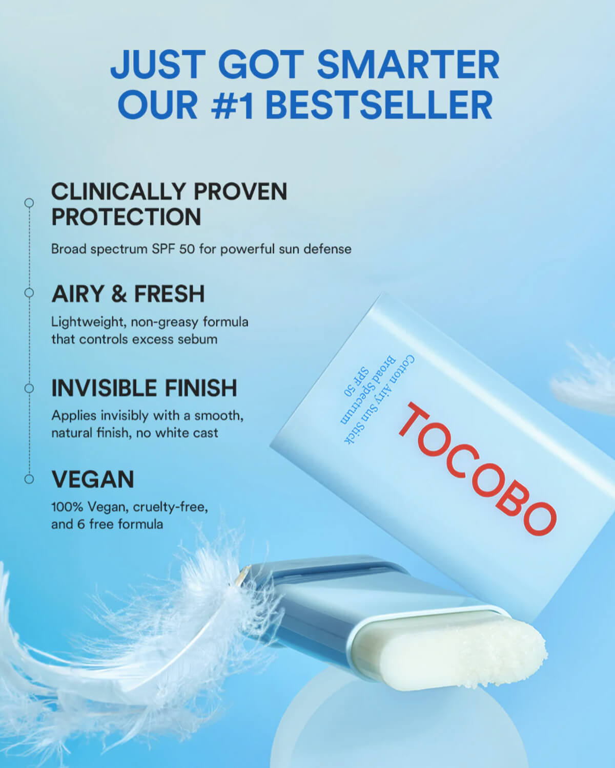 Tocobo Cotton Airy Sun Stick SPF 50+ PA++++ is a weightless, vegan sunscreen that glides on smoothly and helps control excess shine. Perfect for busy mornings and convenient for reapplying throughout the day without disturbing makeup.